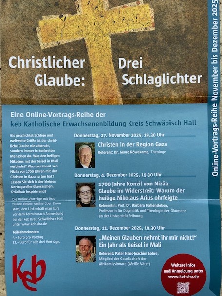 Als geschichtsträchtige, weltweite Größe ist der christliche Glaube nie abstrakt, sondern immer in konkreten Menschen gegenwärtig. Was verbindet den heiligen Nikolaus mit der Geisel in Mali? Was hat das Konzil von Nizäa vor 1700 Jahren mit Christen in Gaza zu tun? Lassen Sie sich in dieser kleinen Vortragsreihe überraschen. Prädikat: inspirierend!